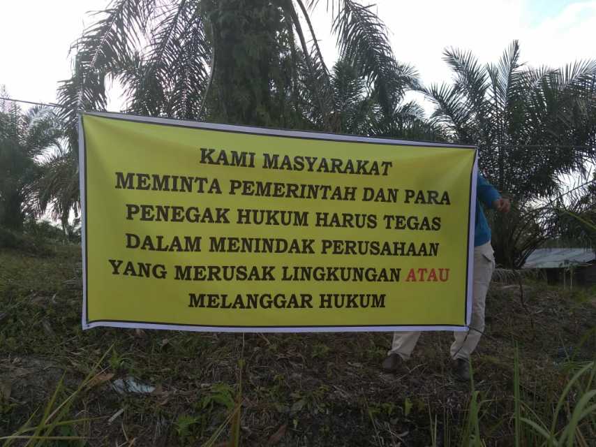 Deretan kalimat lainnya pada spanduk ke dua berbunyi kami masyarakat meminta pemeirntah dan para penegak hukum harus tegas dalam menindak perusahaan yang merusak lingkungan atau melanggar hukum.