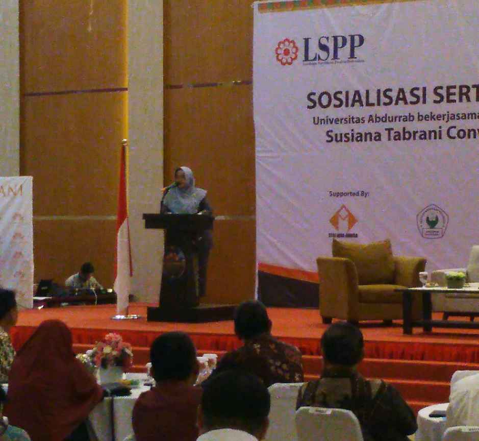 Kemudian Rektor Universitas Abdurrab, Ibu Prof. Susi Endrini, S.Si, M.Si, Ph.D mengucapkan selamat datang kepada seluruh tamu undangan dan peserta sosialisasi. “Beberapa hari lalu kami dipercaya oleh Kemenristekdikti menjadi tempat Uji Kompetensi Untuk Tenaga Kesehatan, dan hari ini Insya Allah kami akan bekerjasama pula dengan LSPP untuk menjadi tempat Sertifikasi Profesi Perbankan khususnya untuk wilayah Riau. Keberadaan sarana dan prasarana yang mumpuni merupakan hal utama dalam kerjasama ini,” Ujar Ibu Susi Endrini. “Kami sangat berterima kasih atas support Yayasan yang sangat kuat. Termasuk keberadaan Susiana Tabrani Convention Hall yang Megah ini,” Tambah Beliau.