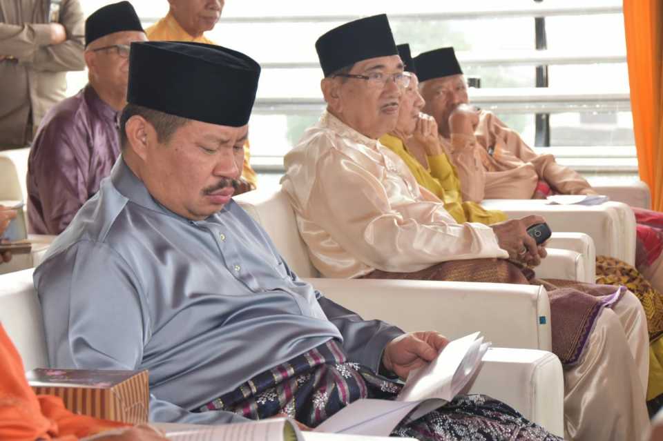 Mantan Kepala Desa Muara Basung, Kecamatan Pinggir ini tiba pada acara tersebut dengan menggunakan pakaian melayu berwarna abu-abu lengkap dengan peci dan kain songket perpaduan warna ungu, hitam dan abu-abu.