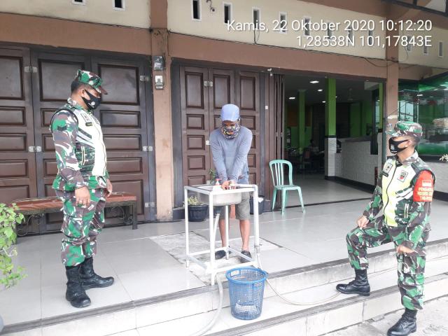 MANDAU, seputarriau.co - TNI Koramil 04/Mandau serta BKO yang dipimpin Babinsa Koramil Serka Fauzi bersama tim satgas gabungan penaganan covid -19 kali ini lakukan himbauan pendisiplinan wajib masker sesuai protokol kesehatan bagi masyarakat singgah di rumah makan Yuanda pada Kamis,  (22/10/2020) sekitar pukul 10.00 Wib.