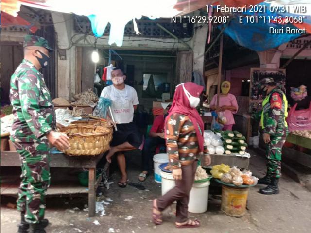 Mandau, seputarriau.co - TNI Koramil 04/Mandau yang dipimpin Koptu MI Silaban beserta Tim lakukan pengecekan pendisiplinan wajib 3 M yaitu Menggunakan masker, Manjaga jarak dan Mencuci tangan dititik keramaian sesuai protokol kesehatan yang dilakukan di Pasar Sartika Duri.