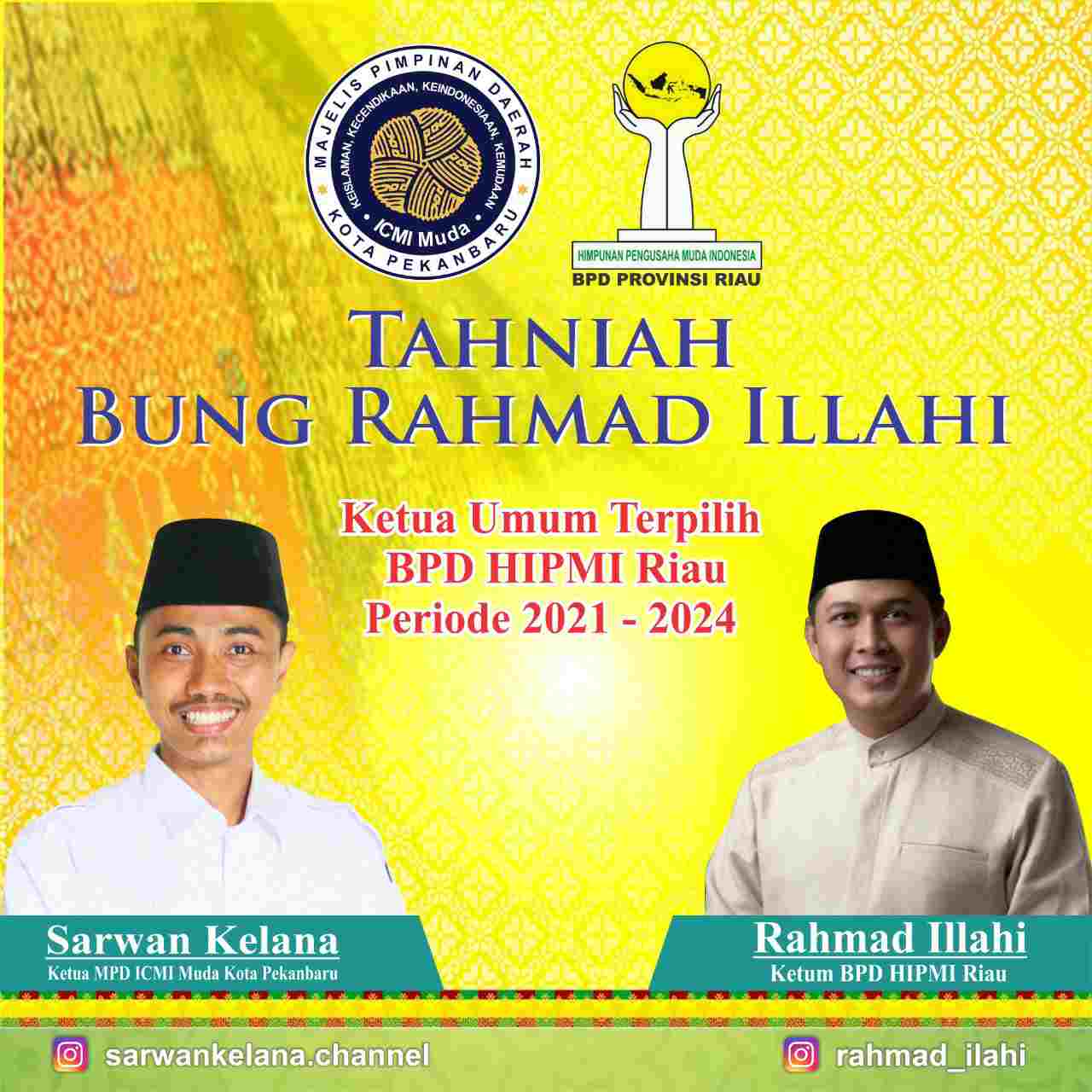 Mendengar kabar Terpilihnya Saudara Rahmad Ilahi Memimpin BPD HIPMI Riau kedepan mendapat ucapan Selamat dari Ketua Ikatan Cendikiawan Muslim Indonesia (ICMI Muda) Kota Pekanbaru bung Sarwan Kelana.