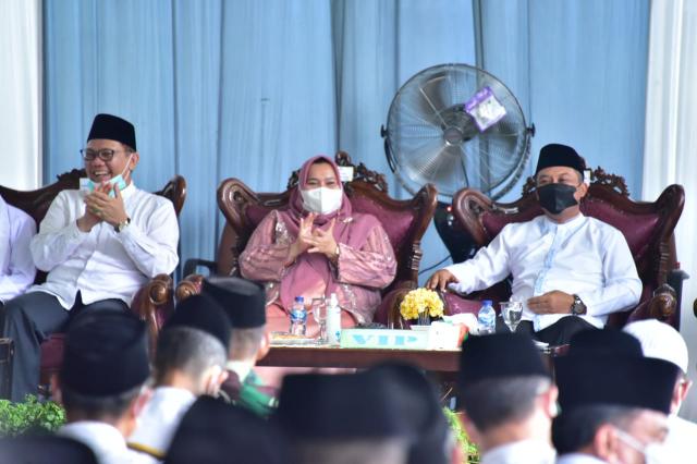 MANDAU, seputarriau.co - Bupati Bengkalis Kasmarni didampingi Wakil Bupati Bengkalis H Bagus Santoso hadiri peringatan maulid Nabi Muhammad SAW 1443 H di Masjid Arafah Duri, Senin (18/10/2021).