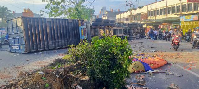 Naasnya,mobil Kontainer tersebut menghimpit pengedara sepeda motor yang diduga meninggal di tempat akibat terjebak di bawah box Kontainer tersebut.