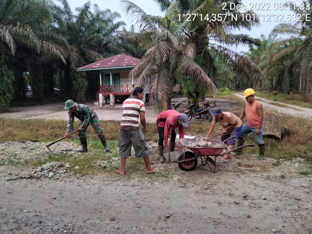BATSOL, seputarriau.co - Babinsa Koramil 03/Mandau, Pos Koramil Bathin Solapan,Serma Sutrisno bersama masyarakat melaksanakan kegiatan Gotong, menimbun jalan yang rusak di RT 01/RW 05, jalan Wonorejo Desa Kesumbo Ampai, Kecamatan Batsol,Kabupaten Bengkalis, Jum'at (02/12/2022) sekira pukul 08.00 Wib.