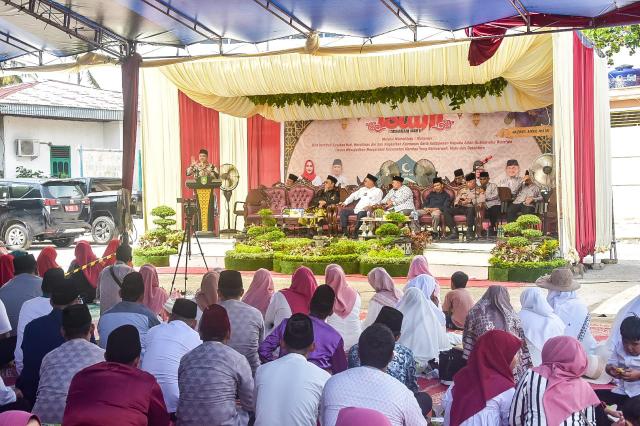 "Semua itu tentunya tidak akan terlaksana dengan baik jika tidak didukung oleh masyarakat. Oleh karena itu kami mengajak para hadirin untuk bersama-sama kita bergandeng-tangan, bahu-membahu dalam membangun daerah ini. Paling tidak, mari kita terapkan nuansa Islami dalam aktifitas kehidupan kita sehari-hari. dan yang tak kalah pentingnya, kami juga mengajak kita semua untuk senantiasa menjaga suasana kondusif di Negeri Junjungan ini dengan memelihara persatuan dan kesatuan serta memperkuat ukhuwah atau tali persaudaraan," tuturnya.