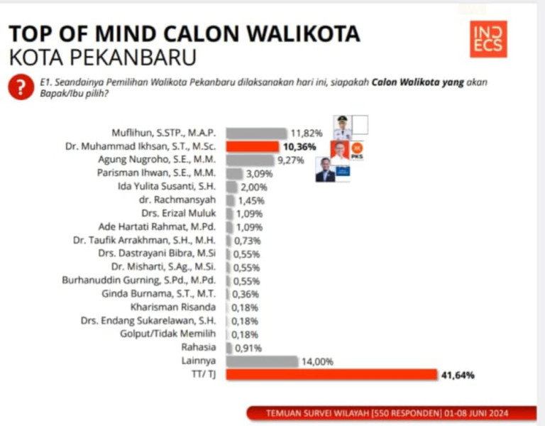 PEKANBARU, seputarriau.co - Indonesia Economy and Election Consultants (INDECS Research Center) baru saja merilis hasil survei yang menggambarkan pandangan dan preferensi politik masyarakat Kota Pekanbaru, menjelang Pilkada serentak 2024. Survei ini, yang dilaksanakan pada awal Juni 2024, menyoroti popularitas, kedisukaan, dan elektabilitas para bakal calon Walikota Pekanbaru. Hasilnya menunjukkan persaingan ketat antara Dr HM Ikhsan MSc, Agung Nugroho, dan Muflihun, yang menduduki posisi tiga teratas dengan perolehan elektabilitas masing-masing 15,45%, 18,73%, dan 16,73%.