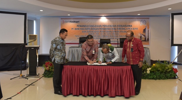 Penandatangan MoU ini dilakukan langsung oleh Ketua Perhimpunan Bank Perkreditan Rakyat Indonesia (Perbarindo Riau) Zahrul Saupi bersama Direktur Utama Bank Riau Kepri DR. Irvandi Gustari dan Kepala OJK Riau Yusri yang disaksikan oleh Ketua Pengelola APEX BPR H. Nusirwan, SE yang sekaligus Pindiv MKM Bank Riau Kepri di ballroom Hotel Pangeran Pekanbaru.