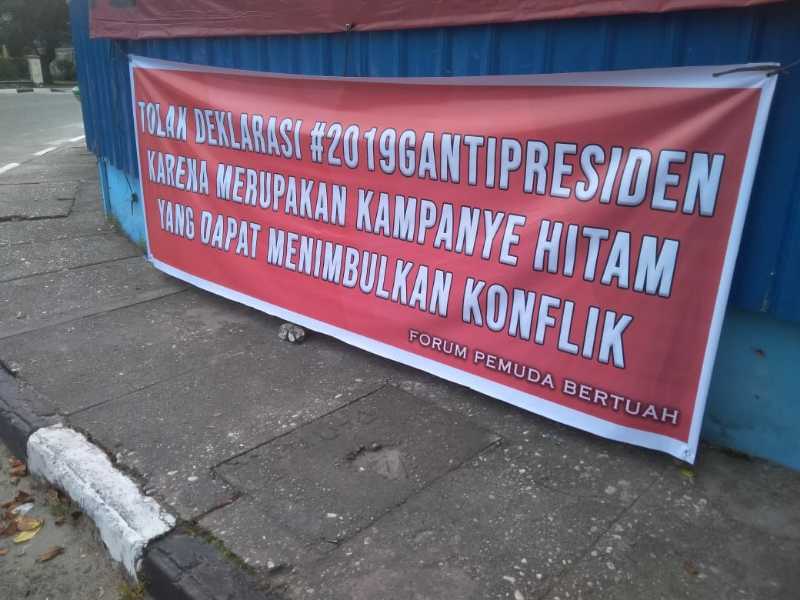 Ada juga yang tertulis "Kami Masyarakat Pekanbaru Menolak Deklarasi #2019GantiPresiden Karena Akan Mengancam Persatuan Dan Kesatuan Bangsa".