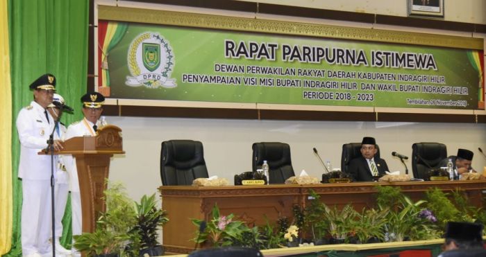 TEMBILAHAN - Bupati Indragiri Hilir (Inhil), M Wardan didampingi Wakil Bupati, Syamsudin Uti menyampaikan program 100 hari kerjanya pada Rapat Paripurna Istimewa di aula gedung Dewan Perwakilan Rakyat Daerah (DPRD), Jalan HR Soebrantas Tembilahan, Senin (26/11/2018).