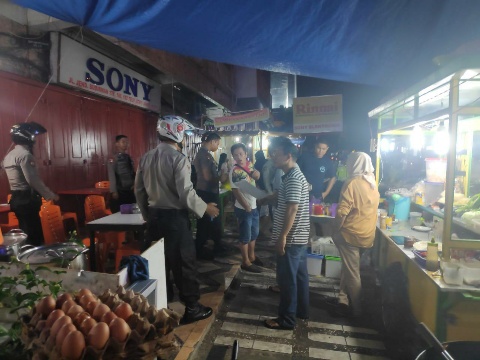 Petugas patroli memberikan imbauan dan sosialisasi pada masyarakat agar terhindar dari virus corona dengan tidak berkerumun, menjalankan social distancing dan tetap menjaga kebersihan diri.