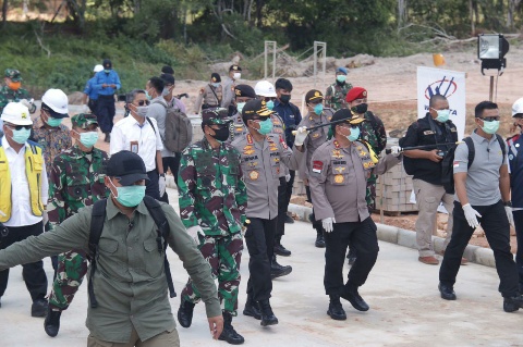 Jakarta, seputarriau ,co - Panglima TNI Marsekal Hadi Tjahjanto bersama Kapolri Jenderal Idham Azis melakukan kunjungan kerja untuk meninjau progres pembangunan RS Khusus penyakit menular yang diperuntukan bagi pasien Covid-19 di Pulau Galang, Kepulauan Riau, Rabu (25/3).